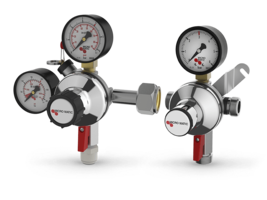 Je nach gewähltem Modell sind auf Anfrage Druckminderer und -reglerbatterien für CO2 oder Stickstoff/Mischgase mit verschiedenen Druckkombinationen lieferbar. Die Batterien sind für die Montage vor Ort oder vormontiert erhältlich.