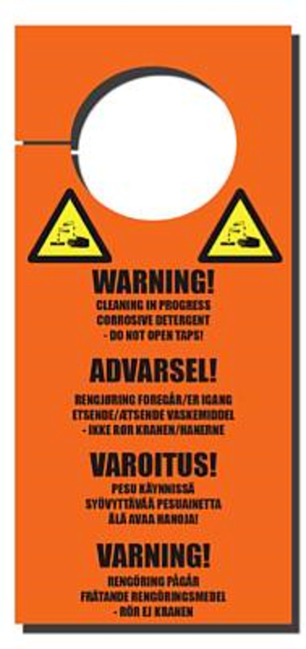 Warning sign "Cleaning in progess" in all Nordic languages.