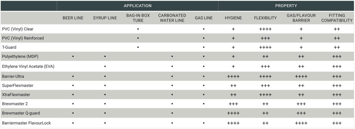 Beverage Tubing: + Fair ++ Good +++ Very Good ++++Excellent