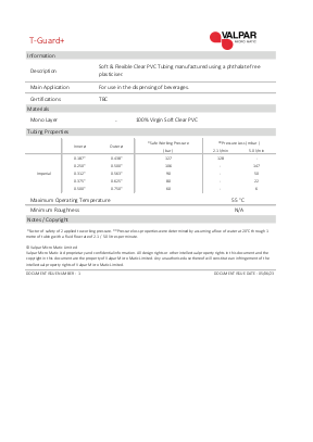 - Organoleptic testing has shown that T-Guard has a significantly low potential of tainting and imparting notorious ‘plastic’ flavours into beverage as seen with other PVC tubing.